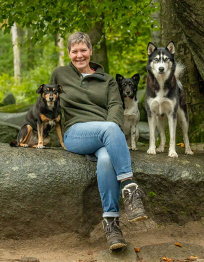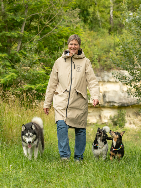 Das bin ich, Sonja Baumann und meine drei netten Hunde Anni, Mi und Jola. Zu meiner Familie gehören auch noch mein Mann, meine drei Kinder, ein Pferd, ein Kater und ein paar Fische im Gartenteich. Meine Hunde sind “Familienhunde” und